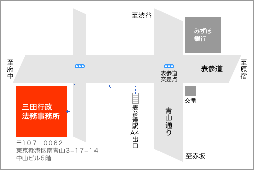 ■道案内■ 東京メトロ銀座線・半蔵門線・千代田線「表参道駅」A4出口の階段を上っていただきますと地上に出ますので、出て左方向に進んでいただき、一つ目の信号を渡っていただいたところに弊事務所の入っております中山ビルがございます。エレベーターで5階にお上がりください。 ご不明な点がございましたら、お気軽にお問い合わせください。